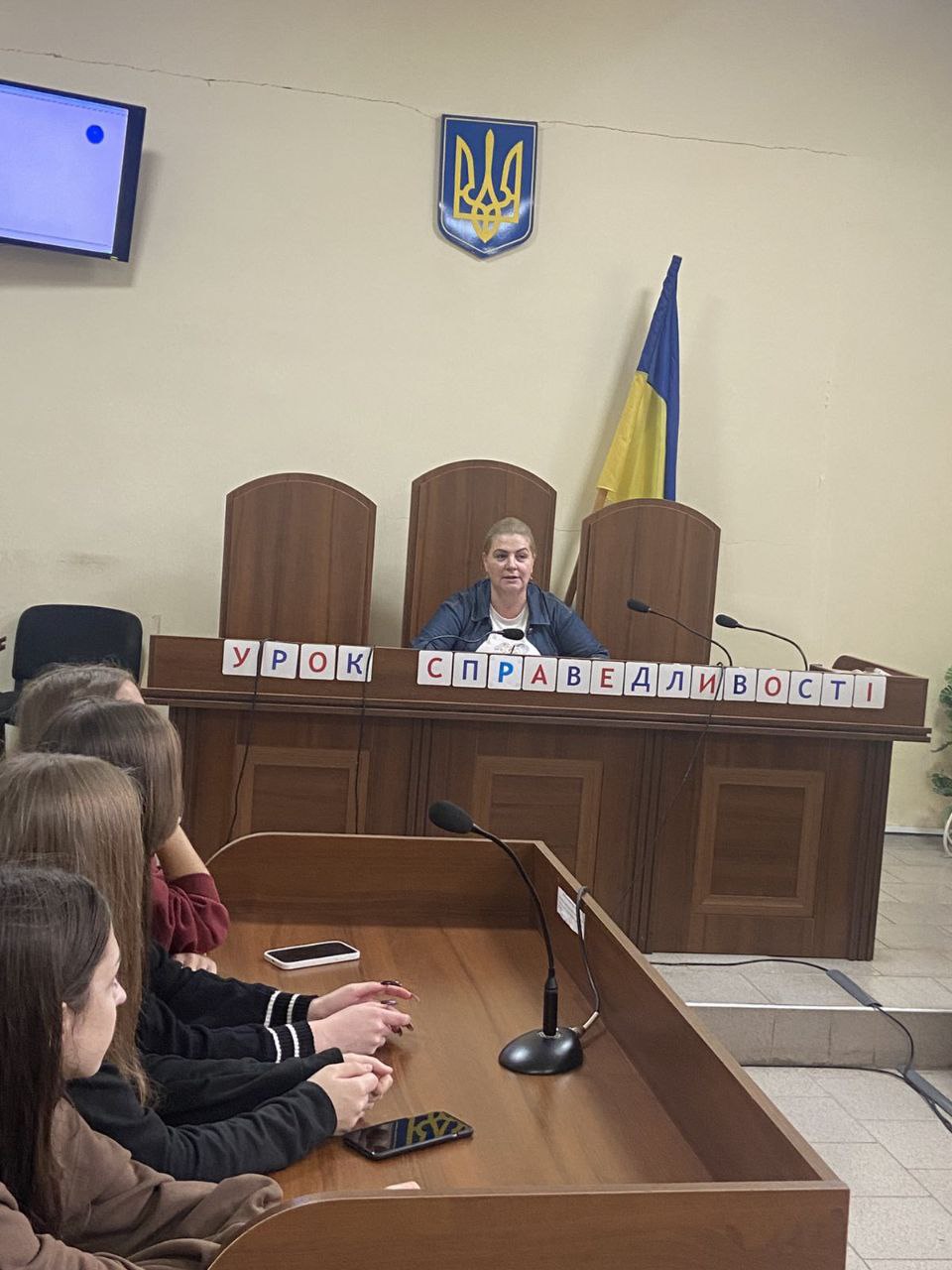Голова суду Орислава Магонь, яка до того ж є суддею, що розглядає справи щодо неповнолітніх, розповіла про види адміністративних стягнень, заходи впливу, що застосовуються до неповнолітніх, види кримінальних покарань, роботу судді та шлях до професії, про правосуддя в цілому, про волонтерську діяльність суддів та працівників апарату суду.